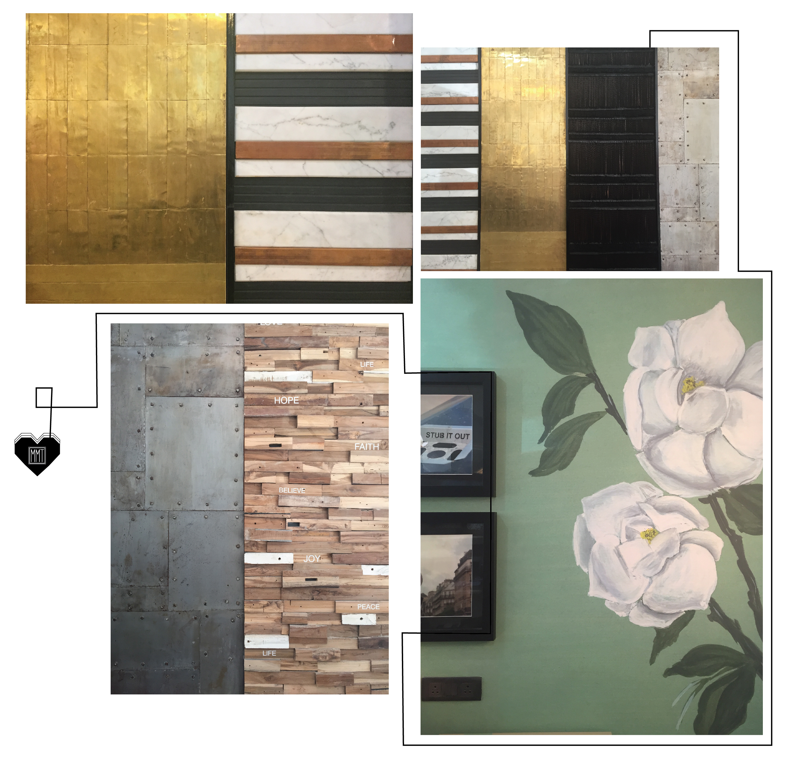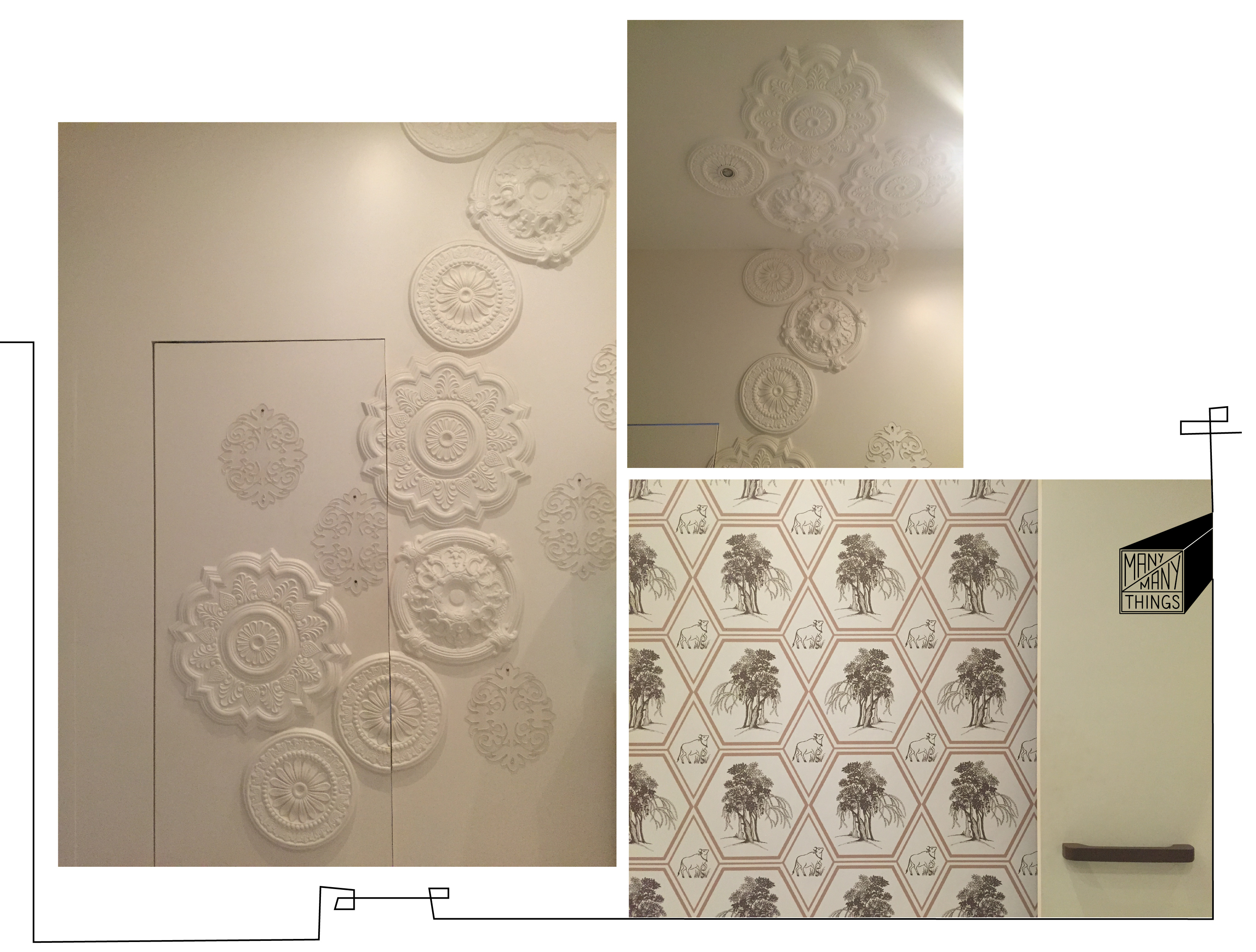 Wall Panels_beated brass, wood, marble, rope, metal sheets and wood| Gulmarg handpainted wall paper – a true special | manymanythings_studioscd