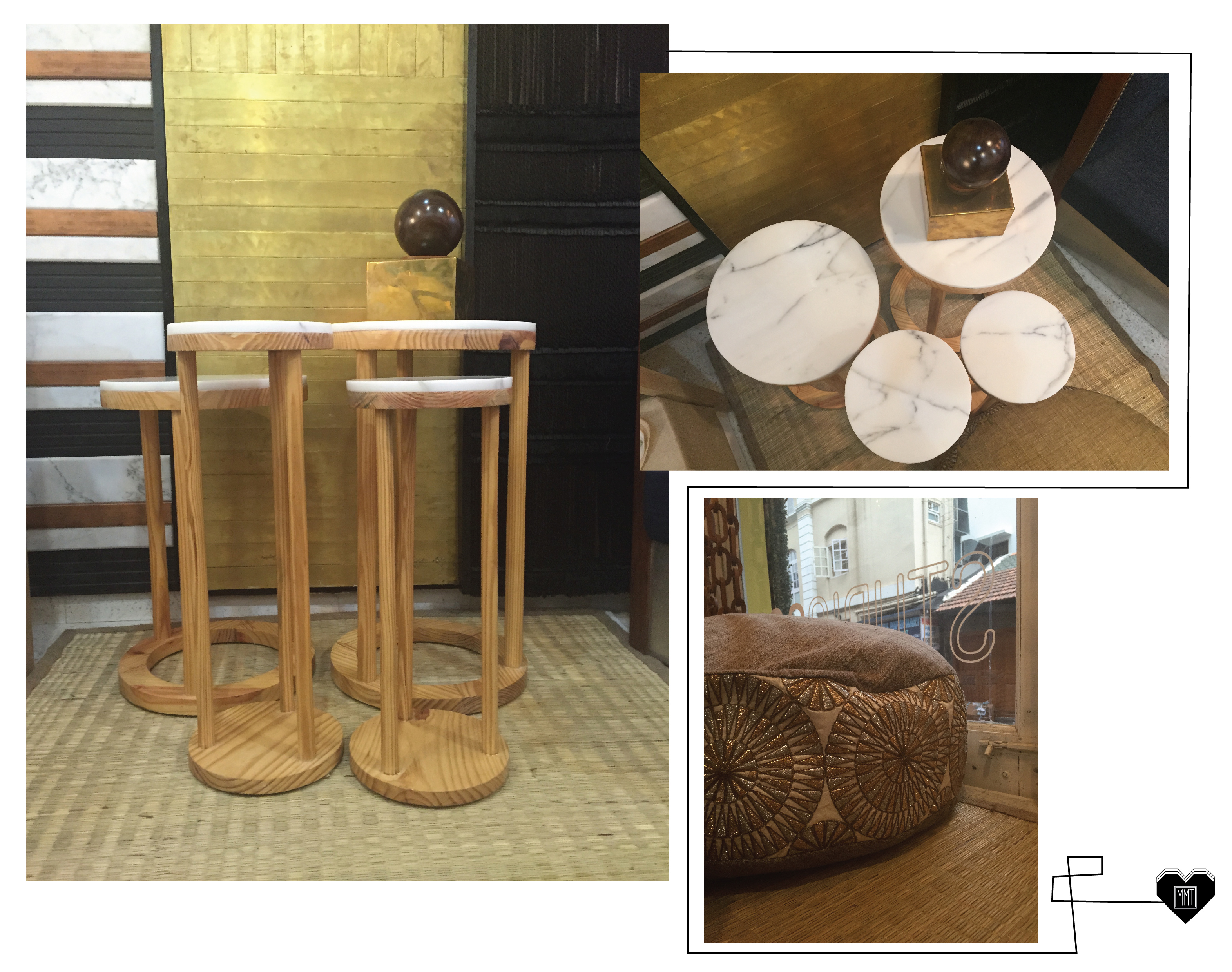 Left and Top Right: Disc side tables, leggy and light. Solid pine wood with Statuario marble tops | Bottom Right: Metallic embroidered poof | manymanythings_studioscd