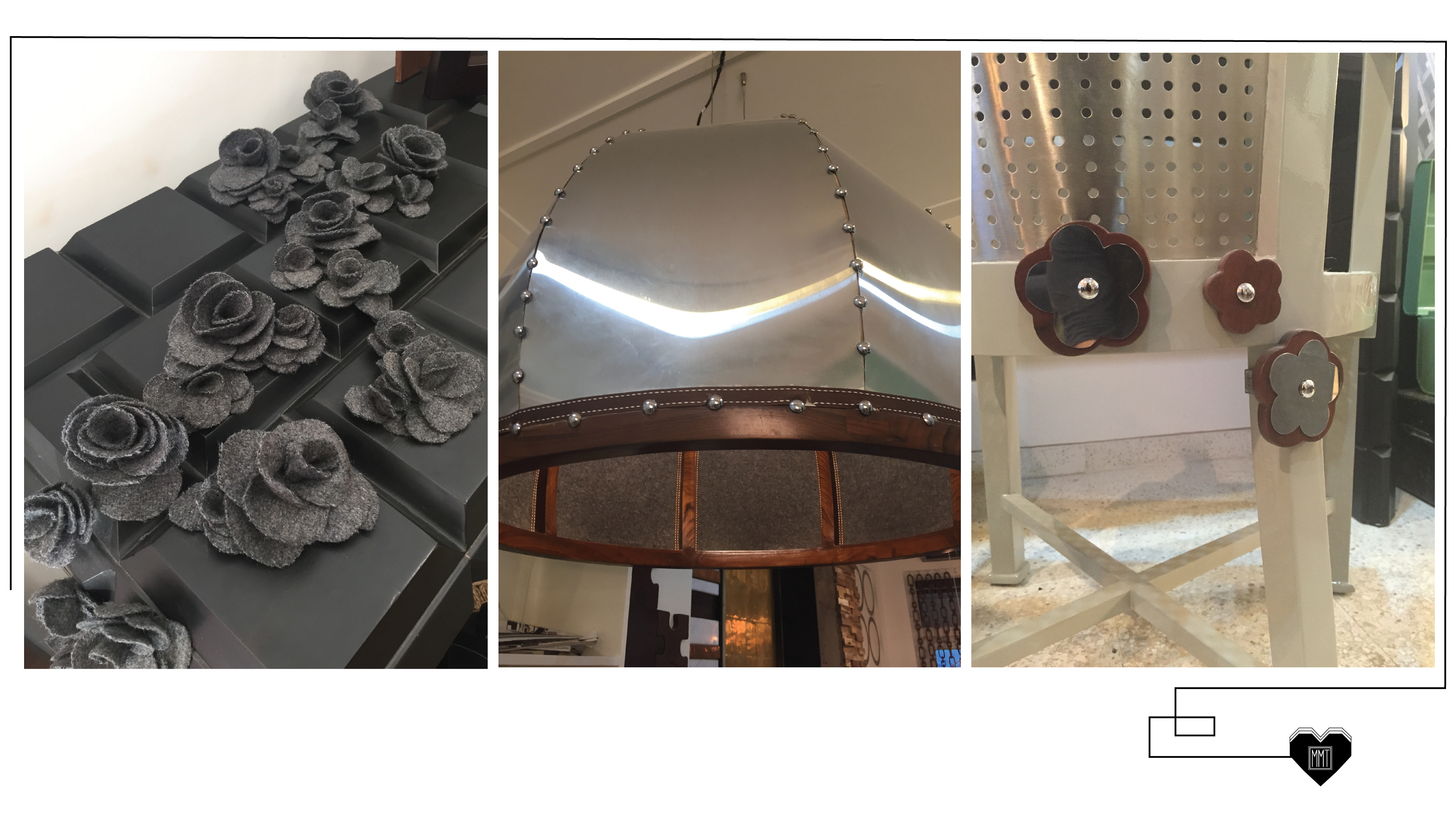 Devil in the details | Left: Felt flowers on upscaled teak, Center: EDIDA lighting award winner_ElleDecor, Right : Steel on wood and felt flowers on the flower power chair| manymanythings_studioscd